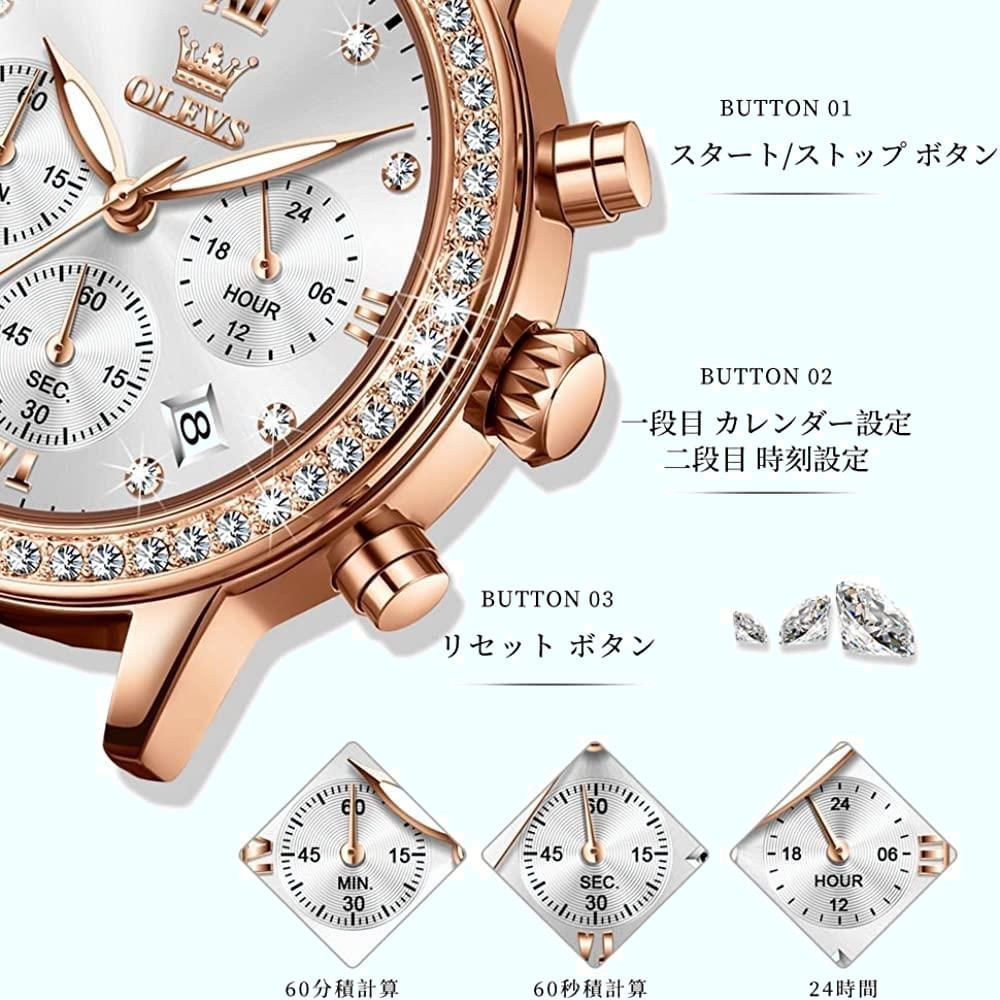 商品 OLEVS 腕時計 レディース かわいい 革ベルト 時計 レザー クロノグラフ クォーツ ローズゴールド クリスタル ブレスレット セット 軽量 薄型 防水 日付 夜光 ホワイト ladies watch