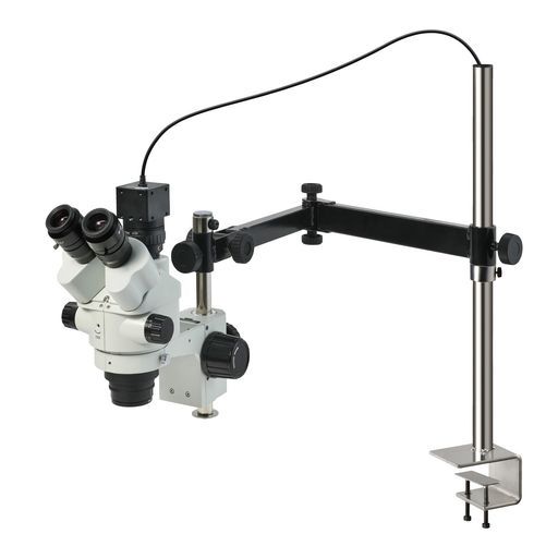 カメラが接続できるズーム式&高機能USBカメラ。自由度の高いロングアーム。撮影と観察作業が同時に行える三眼実体顕微鏡と、堅牢で取付ネジを多数備えた500万画素USBカメラのセットです。