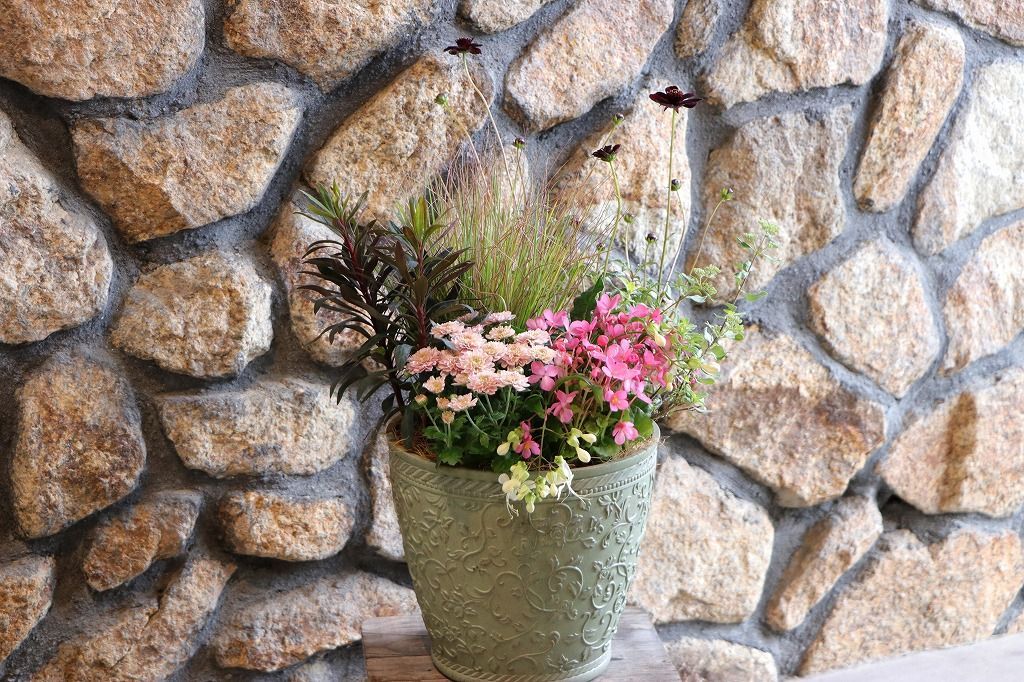 季節の花苗を使い、カルナックさんの高級感のある植木鉢に寄せ植えしました♪